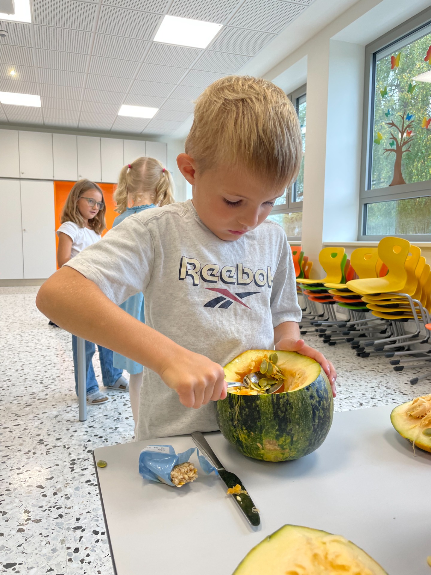 Heute schnitzten die Kinder im Fach Kunst und Gestalten ihren eigenen Kürbis. Sie hatten viel Freude dabei und freuten sich über ihre Ergebnisse. Hier einige Eindrücke: